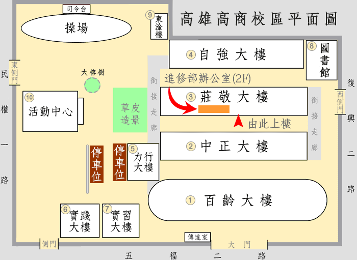 | 進修部辦公室位於莊敬大樓(第三棟) 二樓。 【平面圖】 ![]() |